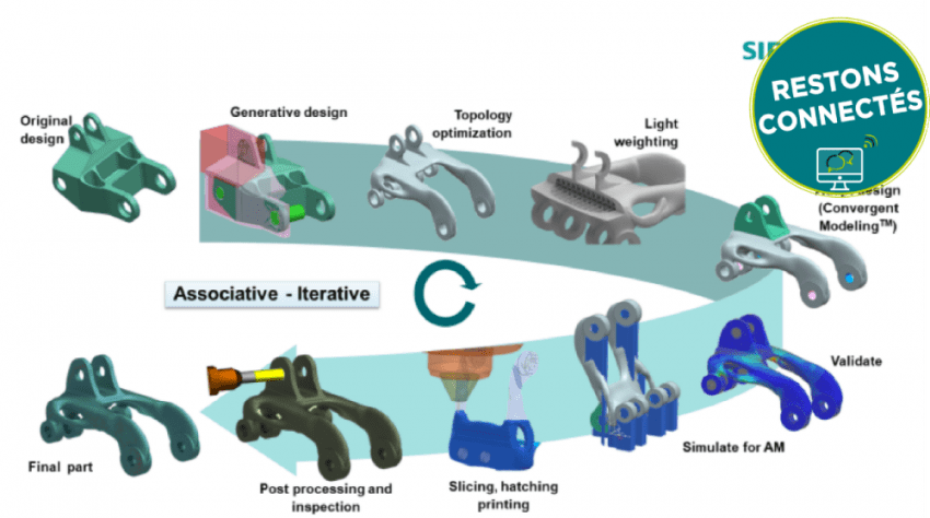 Siemens a développé de nombreux logiciels disposant ainsi la chaine de valeur complète digitalisée d’un produit/process depuis le design de la pièce (NX) – son optimisation topologique (TOPOL) – sa fabrication virtuelle par additive manufacturing.